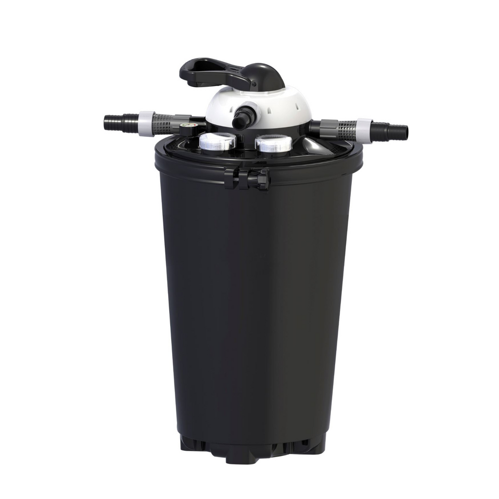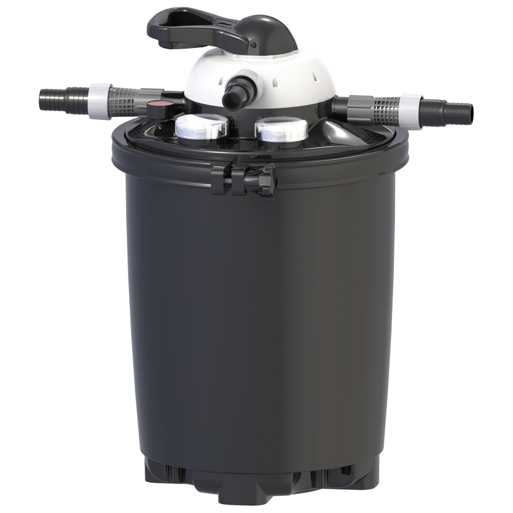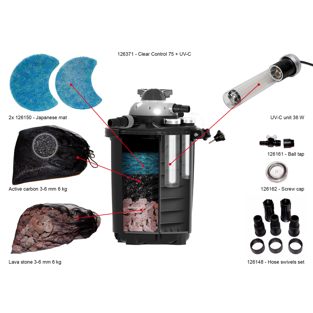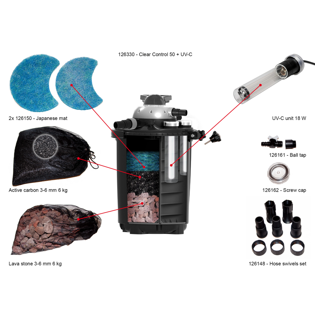 Wenn Sie eine Fontäne, Bachlauf oder einen Wasserfall betreiben ist es wichtig, dass das Teichwasser klar ist und bleibt. Clear Control Druckfilter können hohem Druck aushalten und das Wasser kann hinter dem Filter noch einen Höhenunterschied überbrücken. Neben der normalen Filterung gibt es verschiedene Fließrichtungen um Fischmedikamente zuzufügen, den Filter zu reinigen oder den Teich zu entleeren. Die eingebaute UV-C Lampe tötet Schwebealgen und Krankheitskeime und klärt schnell grünes Teichwasser. Einschließlich aller Filtermaterialien und Anschlüsse für Schlauchdurchmesser 32 und 40 mm.