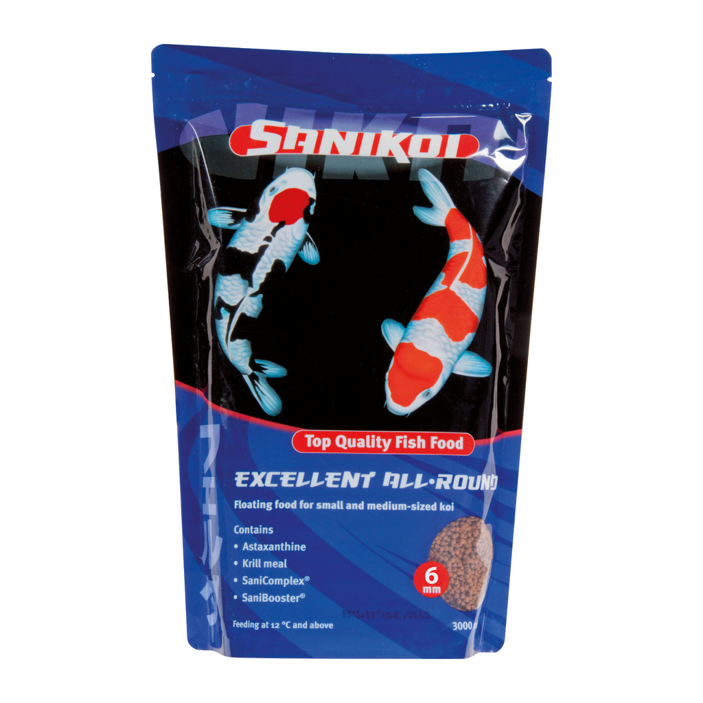 SaniKoi Excellent All-Round ist ein hochwertiges Futter für japanische Koi und andere wertvolle karpfenartige Fische. Es ist ein schwimmendes Futter, das ein hervorragendes Wachstum und ein natürliches Farbmuster fördern kann. Die Hauptzutaten bestehen aus Fischprodukten, pflanzlichen Proteinen, Fetten, Kohlenhydraten und werden mit Krillmehl ergänzt. Besondere Aufmerksamkeit wurde den zugesetzten Spurenelementen und Vitaminen gewidmet, darunter stabilisiertes Vitamin C. Um leuchtende Farben zu erhalten, wurde dem Futter Astaxanthin zugesetzt. SaniKoi Food ist ein schwimmendes Hauptfutter, das bei Wassertemperaturen ab 12 °C verwendet wird. Füttern Sie mehrmals am Tag. Achten Sie darauf, dass das Futter innerhalb von 5 Minuten aufgefressen wird. Durch die spezielle Zusammensetzung des Futters wird das Wasser nicht getrübt und die Teichumgebung und der Filter werden kaum belastet.
